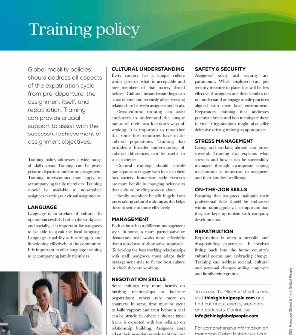 Explore the training policy associated with international assignments.